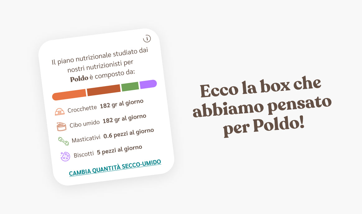 Il piano nutrizionale nasce per rispondere alla tua esigenza di avere sempre sotto controllo tutte le indicazioni per nutrire al meglio il tuo pet. Ma proprio perché la fase di passaggio verso un nuovo cibo è sempre un momento delicato, potresti aver bisogno di una zampa in più. Tramite l’esclusivo servizio di consulenza gratuita potrai parlare con i nostri veterinari nutrizionisti sia prima che dopo l’acquisto, per risolvere ogni dubbio che riguarda l'alimentazione del tuo pelosetto.
