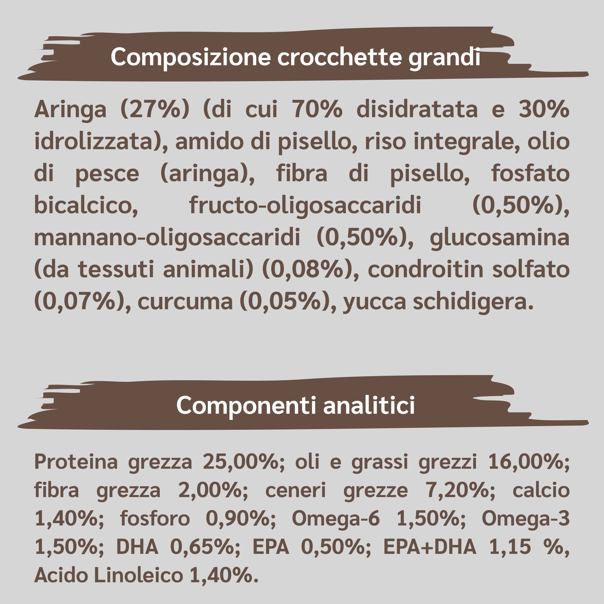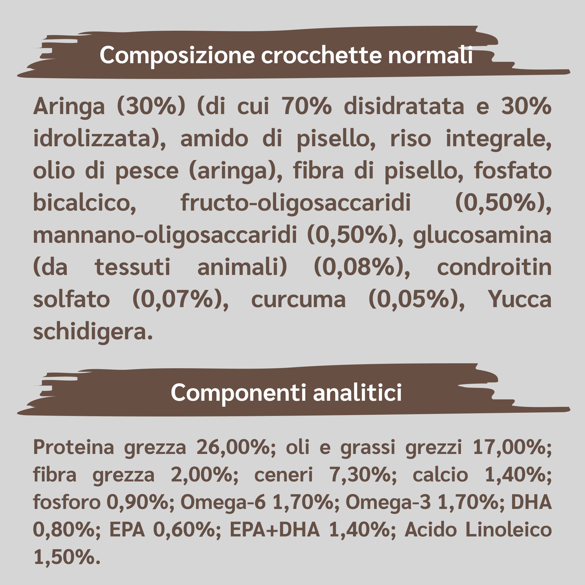 Aringa (27%) (di cui 70% disidratata e 30% idrolizzata), amido di pisello, riso integrale, olio di pesce (aringa), fibra di pisello, fosfato bicalcico, fructo-oligosaccaridi (0,50%), mannano-oligosaccaridi (0,50%), glucosamina (da tessuti animali) (0,08%), condroitin solfato (0,07%), curcuma (0,05%), yucca schidigera.