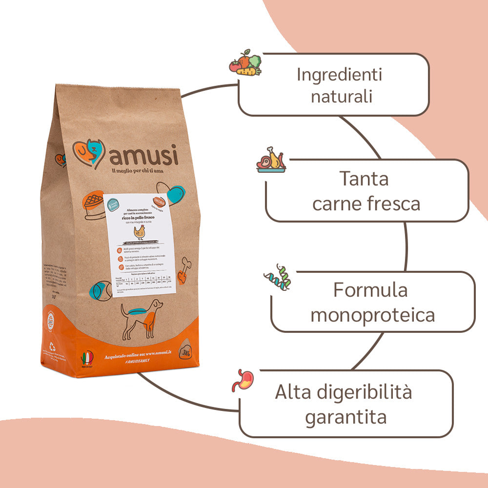“”Con le crocchette amusi ho risolto diversi problemi al mio cagnolino: sono prodotti genuini, ben digeribili (non cosa facile per il mio) e davvero appetibili.