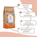 Le crocchette con Maiale fresco, Patate e Zucca offrono un pasto completo e naturale, formulato con esperti nutrizionisti per i cani adulti più sensibili. La ricetta monoproteica e senza cereali, con il 50% di carne di maiale, garantisce gusto, nutrimento ed elevata digeribilità. Come tutte le ricette amusi, la digeribilità è attestata dal Dipartimento di Scienze Mediche Veterinarie dell’Università di Bologna.