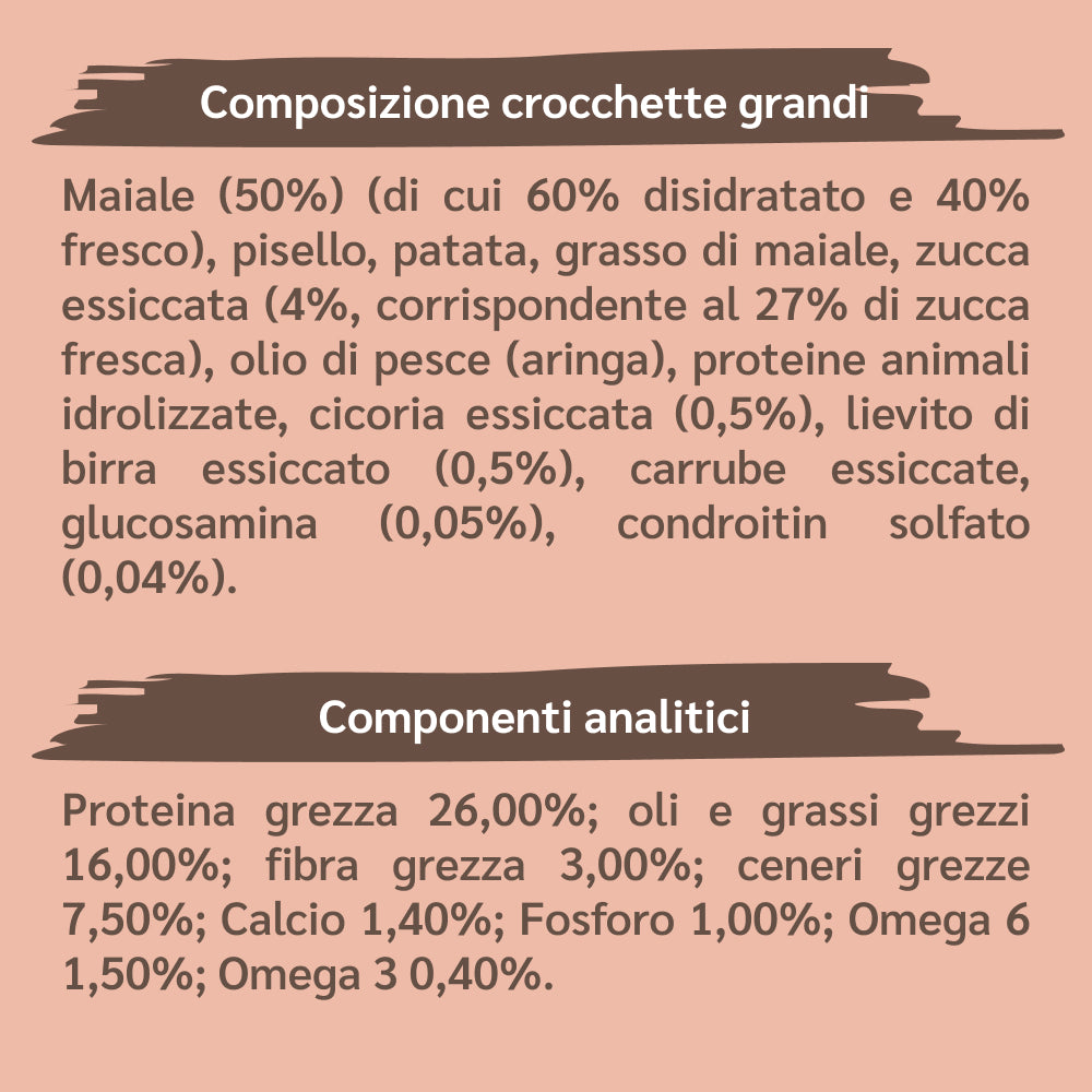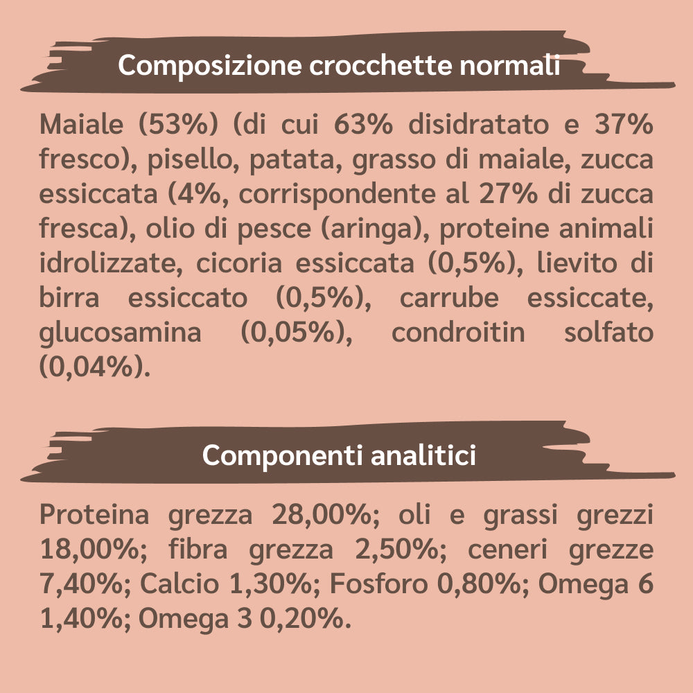 Maiale (50%) (di cui 60% disidratato e 40% fresco), pisello, patata, grasso di maiale, zucca essiccata (4%, corrispondente al 27% di zucca fresca), olio di pesce (aringa), proteine animali idrolizzate, cicoria essiccata (0,5%), lievito di birra essiccato (0,5%), carrube essiccate, glucosamina (0,05%), condroitin solfato (0,04%).
