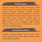 Salmone fresco 50%, Piselli decorticati, Piselli 12%, Proteina di piselli, Polpa di mele essiccata 3,15%, Sostanze minerali, Proteine vegetali idrolizzate, Lieviti inattivati idrolizzati 1,5%, Olio di mais, Lieviti inattivati, Inulina di cicoria - fonte di FOS 0,3%, Zucca disidratata 0,25%, Fibra di pisello, Prodotti del lievito – fonte di β-Glucani (800 mg/kg), Yucca Schidigera (250 mg/kg), Prodotti ottenuti dalla trasformazione di erbe (Curcuma longa 80 mg/kg).