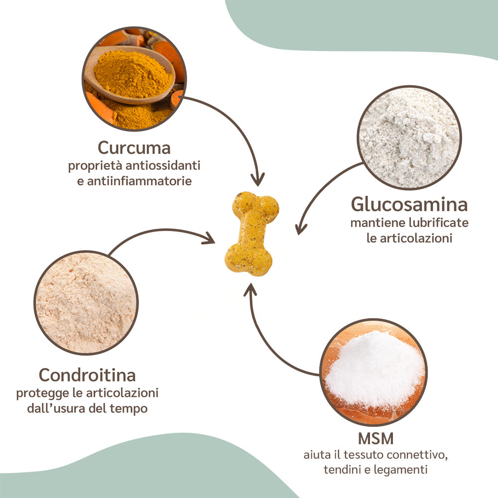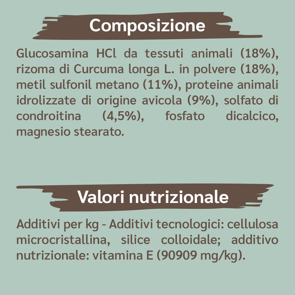 Glucosamina HCl da tessuti animali (18%), rizoma di Curcuma longa L. in polvere (18%), metil sulfonil metano (11%), proteine animali idrolizzate di origine avicola (9%), solfato di condroitina (4,5%), fosfato dicalcico, magnesio stearato.